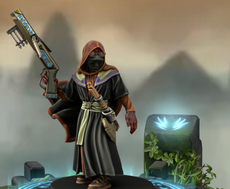 Ausrüstung: Schusswaffe mit Runen, schwarze Robe mit violetten Kanten, verdecktes Gesicht